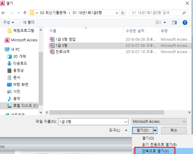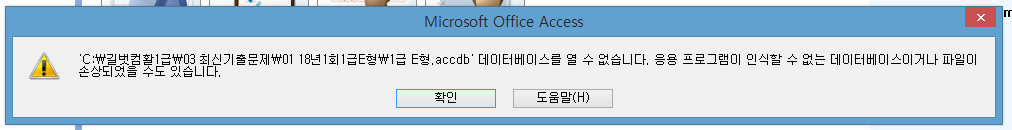 다른 것들은 잘 됐었는데 최신기출문제 폴더에 있는 액세스파일이 저렇게 오류뜨면서 열리질 않아요