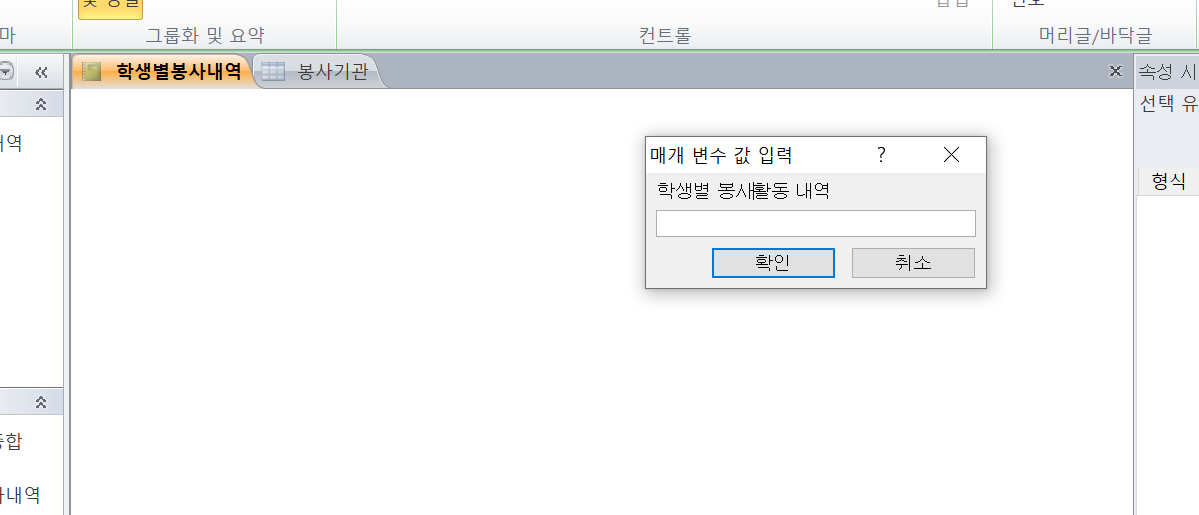 '학생별 봉사활동 내역'의 테이블이나 쿼리를 찾는 것입니다.