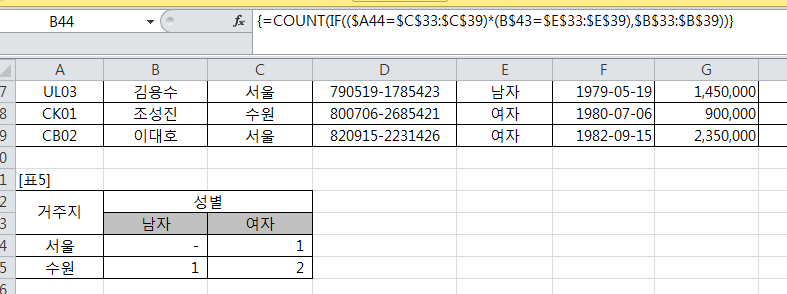 =COUNT(IF(($A44=$C$33:$C$39)*(B$43=$E$33:$E$39),$B$33:$B$39)) 이렇게 수식을썼는데 왜 -로 나타나는건가요?
