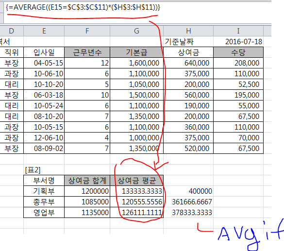=AVERAGEIF($C$3:$C$11,E15,$H$3:$H$11)의 평균함수 사용하는건 알겠는데