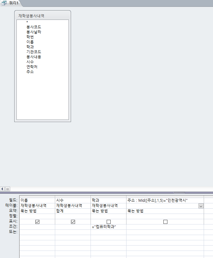 두 가지 조건을 모두 만족시켜야 하는 문제이므로 컴퓨터학과와 같이 조건을 같은 라인에 지정해줘야 합니다. 그러므로 교재처럼 지정하셔야 합니다.