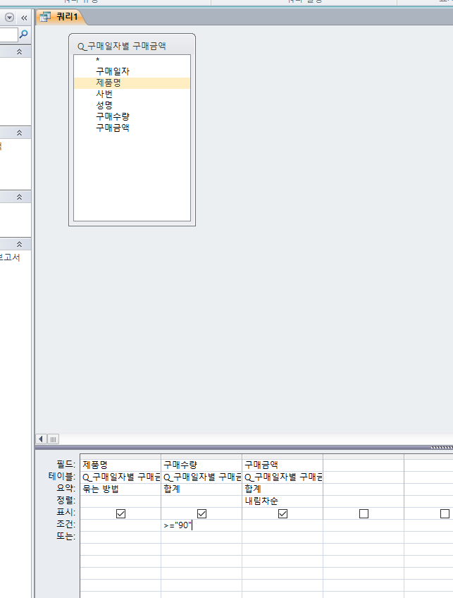 구매 테이블의 구매수량 필드의 데이터 형식이 텍스트 형식으로 되어 있는 것 같아요. 숫자 형식으로 지정하셔야 합니다.