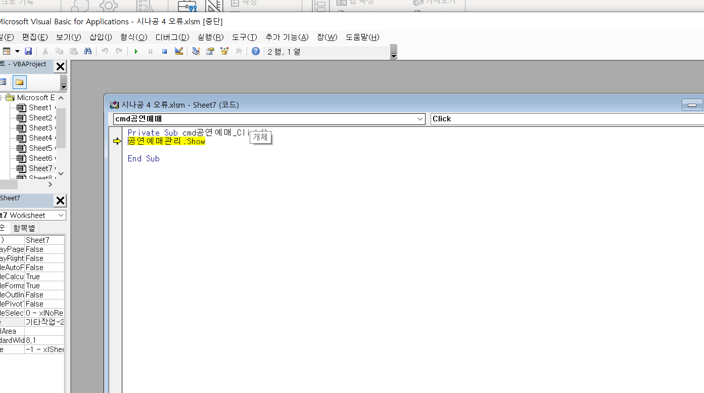 답그대로 공연예매관리.show하고 엑셀로 돌아가서 디자인모드 풀고 버튼을 누르면 계속 오류가 난다고 뜹니다 그럼 디버그를 눌러서 확인해보면