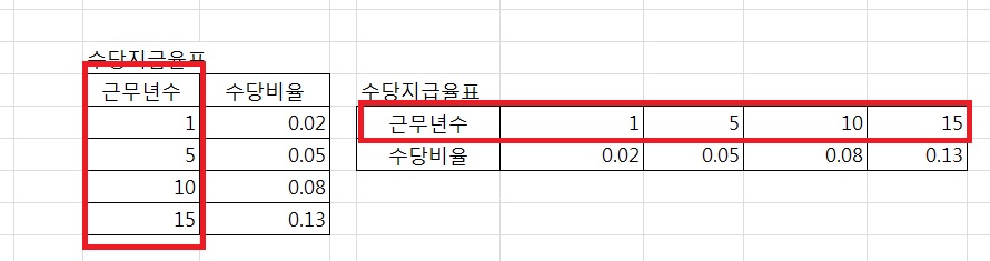 근무년수를 구할때 구하고자 하는 근무년수가 세로로 되어 있을때는 vlookup