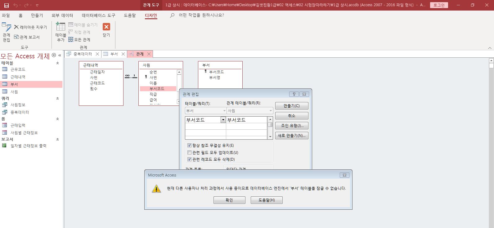 관계 창만 열어놓고 나머지 창은 모두 닫은 후 작업하세요.