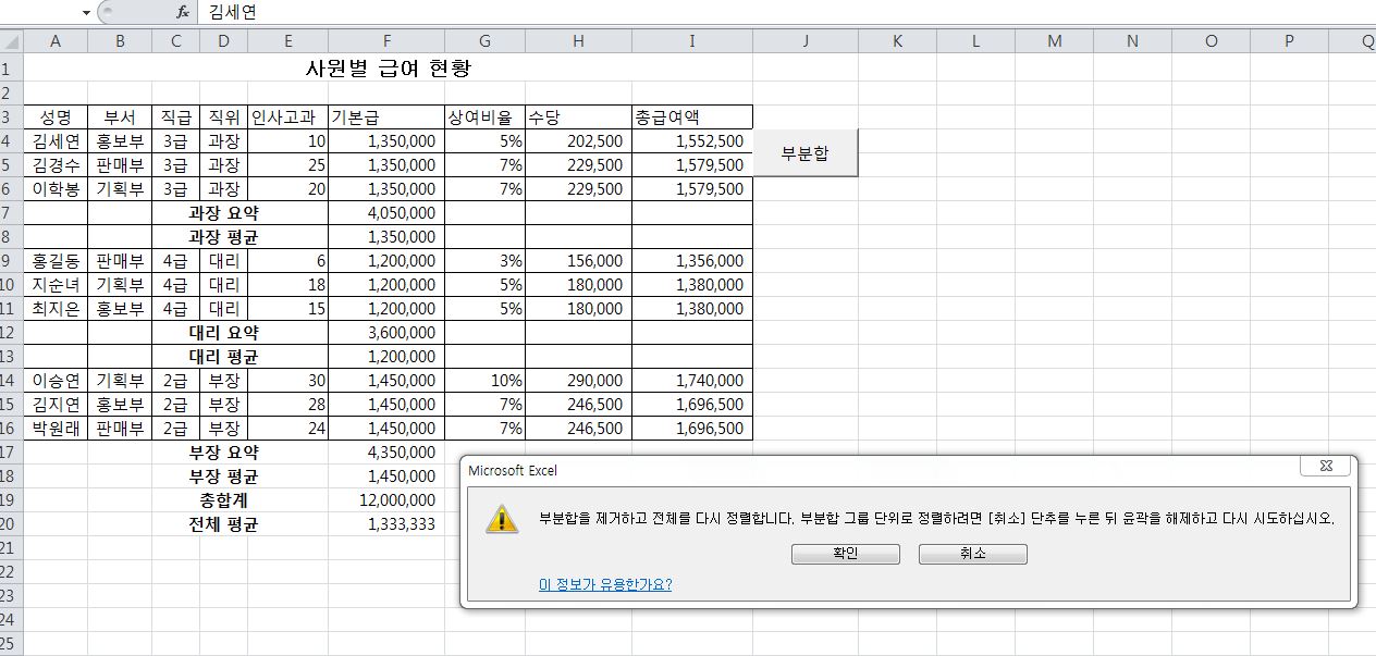 부분합을 제거한 후 부분합 단추를 눌러 확인 해 보세요.