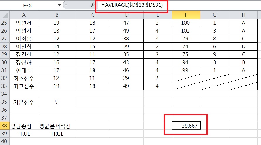 문서작성들을 평균내보면 40이고 김성룡의 문서작성은 40이므로 조건이 성립하지 않아야 하는데 엑셀에서는 TRUE로 처리해버리네요 왜그런건가요?