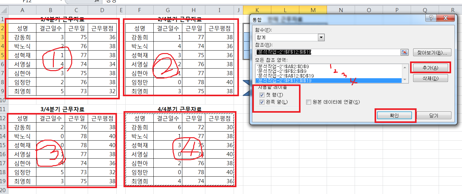 K2:M5 까지 범위로 잡은 후 데이터 통합에서