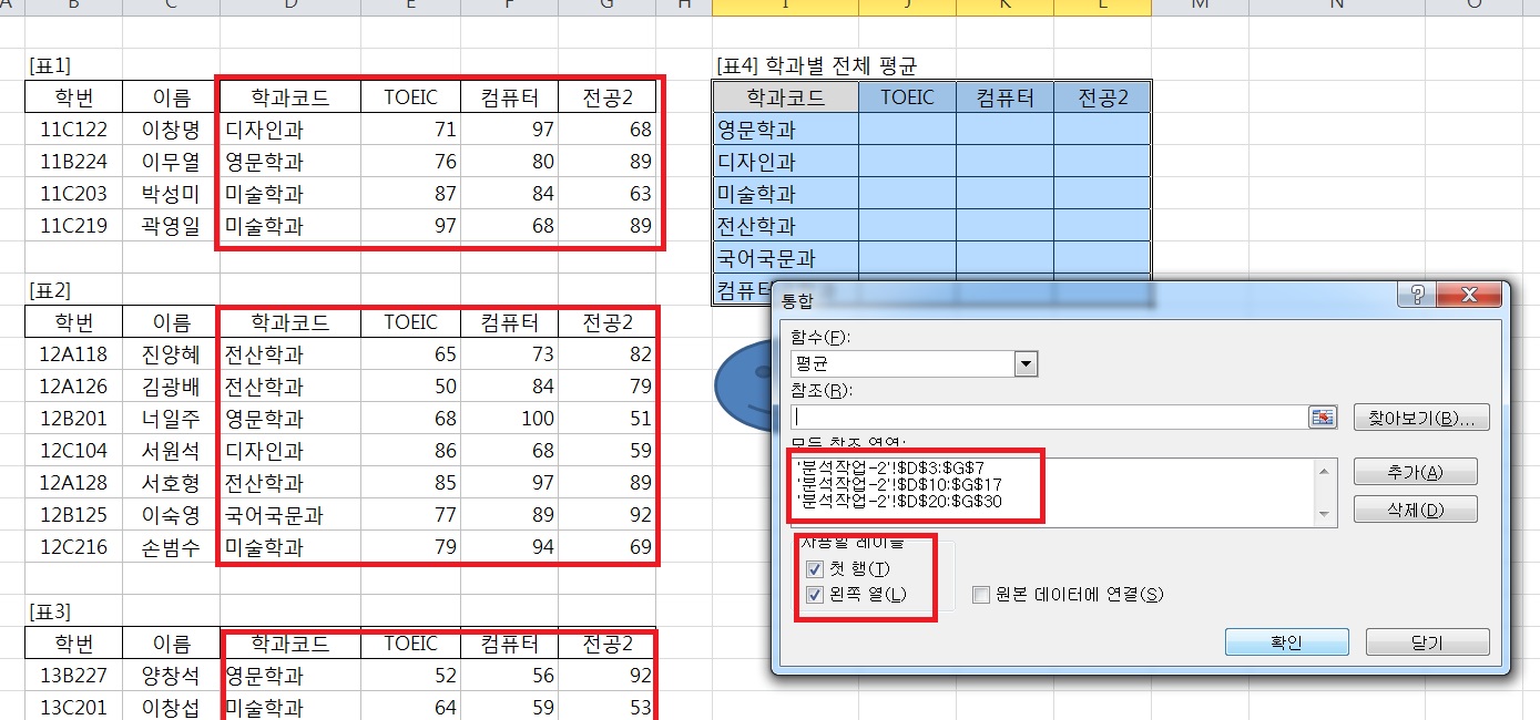 통합창에서 아래와 같이 범위를 추가한 후 행,열에 체크하고 확인 하세요.