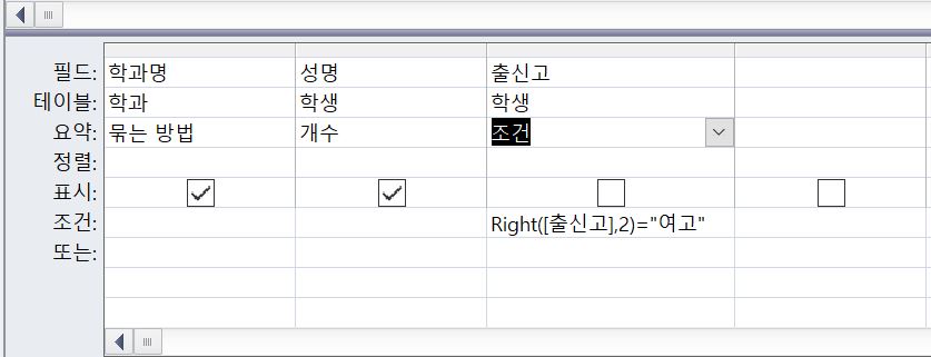 출신고의 조건을 지정할때 필드에 right함수를 쓰지 않고 첨부한 파일처럼 조건을 지정해도 정답이 되나요?