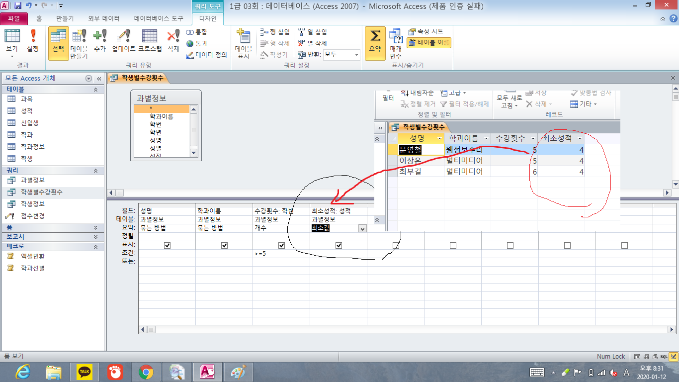 올려주신 그림만 봐서는 원인을 파악하기가 어렵습니다. 쿼리의 레코드 원본인 테이블을 열어서 성적 값을 확인해보세요. 그래도 모르시겠다면 작성하신 액세스 파일 자체를 올려주세요.