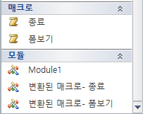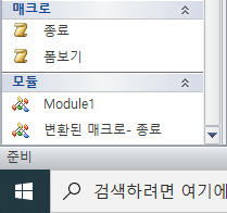 매크로 작성기로 작성 후, '매크로를 visual basic으로 변환'을 선택해서 변환을 하면, 아래 사진처럼 탐색 창에 처음에 매크로 작성기로 만들어진 매크로 이름과 모듈에서는 '변환된 매크로'라는 이름으로 visual basic으로 변환된 매크로 이름이 뜹니다.