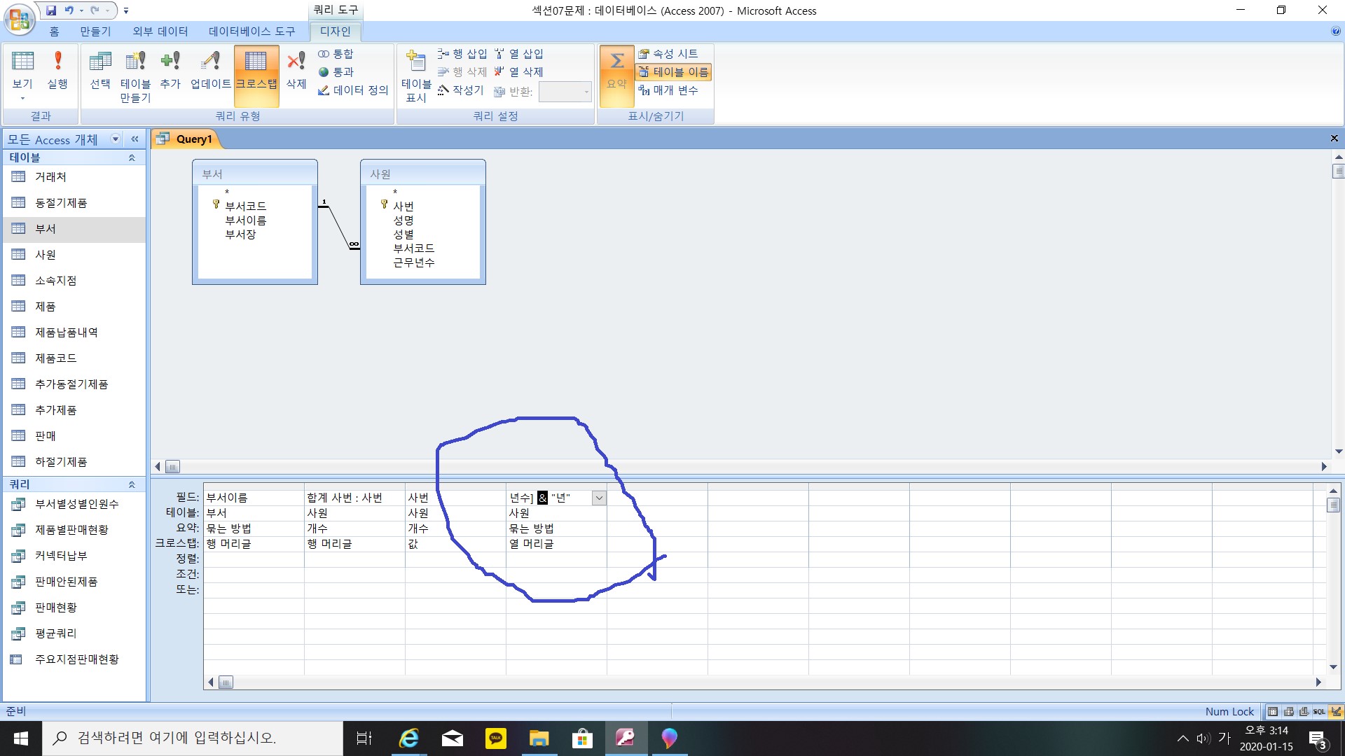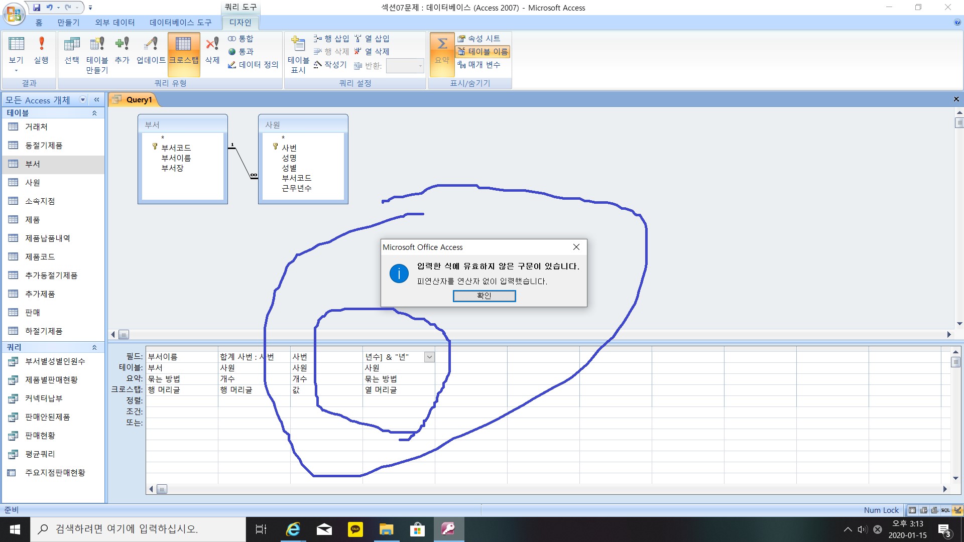 작성한 액세스 파일 자체를 올려주세요. 그림만으로는 확인이 불가능합니다.