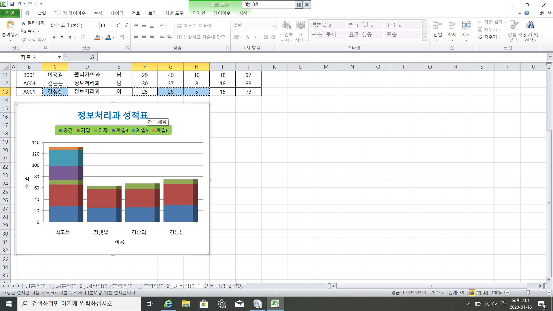 Q. '출석'계열은 삭제하고 13행에 입력되어 있는 강성실의 데이터를 추가하시오.