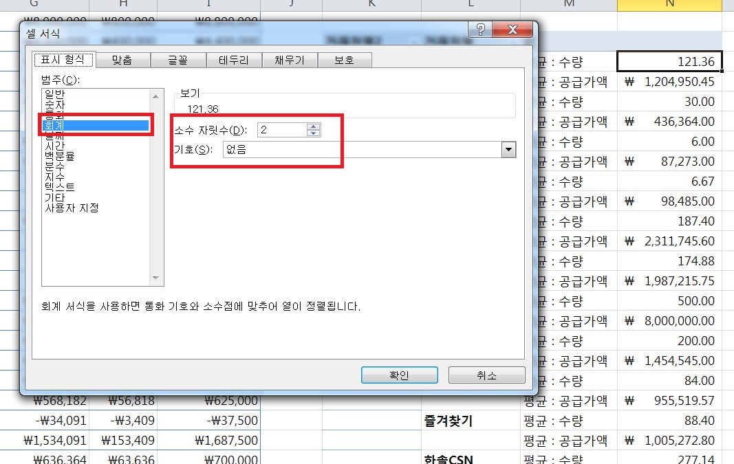 수량에 해당하는 값에는 셀서식 -> 회계 -> 소수자리수 2, 기호 없음을 지정하고
