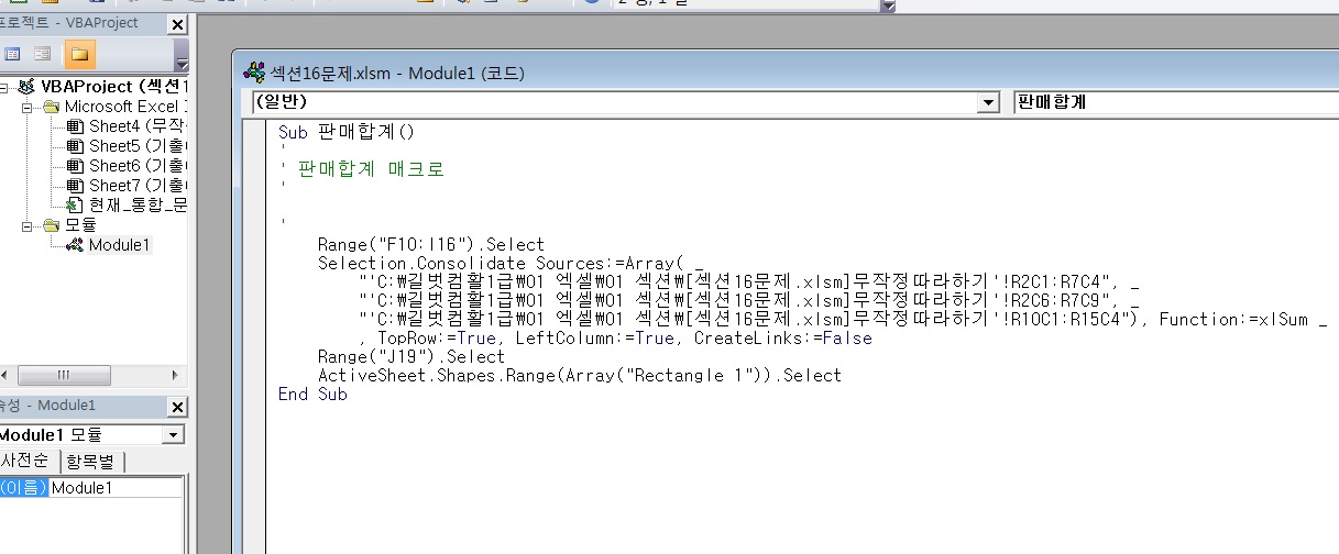 컴퓨터활용능력 1급 실기 기본서 섹션 16 매크로 단원 질문입니다