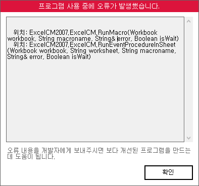 문의하신 오류는 윈도우 환경 문제로 비쥬얼 베이직 쪽에서 오류가 발생한 것으로 보여집니다.