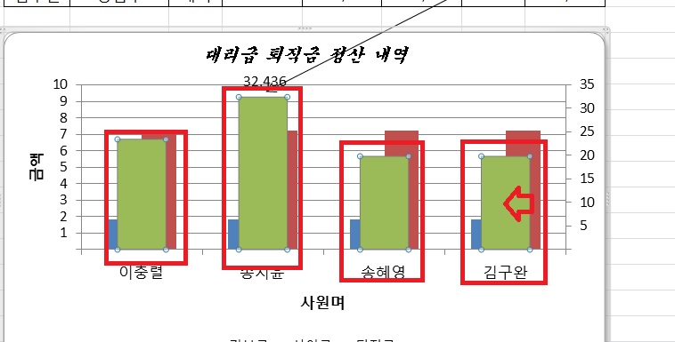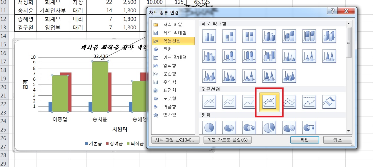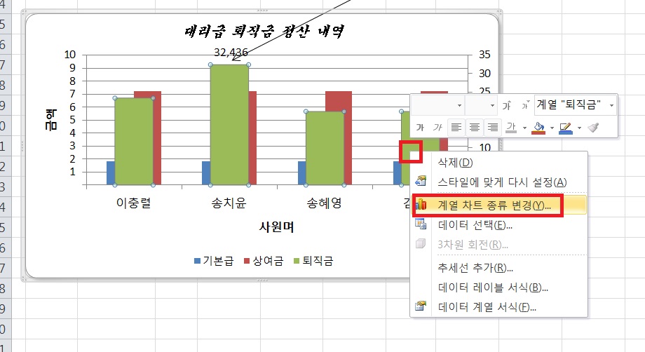 첨부파일 보시면 왼쪽 차트에서 '퇴직금'계열만 선택한게 보이실겁니다. 그리고 오른쪽 마우스 클릭 후 계열 차트 종류 변경으로 꺾은선형으로 바꾸면 선택한 '퇴직금'계열 뿐만 아니라 차트 안에 모든 데이터 계열이 꺾은선형으로 바뀐다 이말입니다.