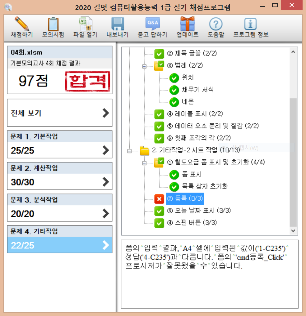 시나공 채점 프로그램이 정답파일과 정확히 일치해야 정답으로 인정 하므로 오답처리 된 것 같습니다.