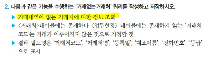 -<거래처> 테이블에는 존재하나 <업무현황> 테이블에는 존재하지 않는 '거래처코드'를 찾는 것