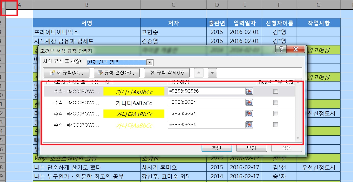 전체 셀을 선택한 후 조건부 서식의 규칙관리에 보시면 조건부 서식이 4개가 지정되어 있습니다.