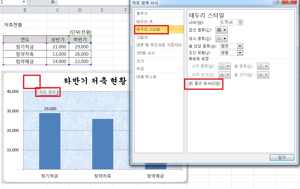 차트 영역의 테두리 스타일을 '둥근 모서리'로 설정하라고 했는데