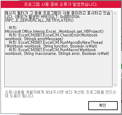 문의하신 오류는 엑셀프로그램의 vb 기능에 문제가 발생해 오류 메시지가 나타난 것으로 보입니다.