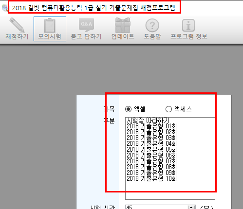 구매하신 도서에 맞는 채점프로그램명은 '2018 길벗 컴퓨터활용능력 1급 기출문제집 실기 채점프로그램' 입니다.