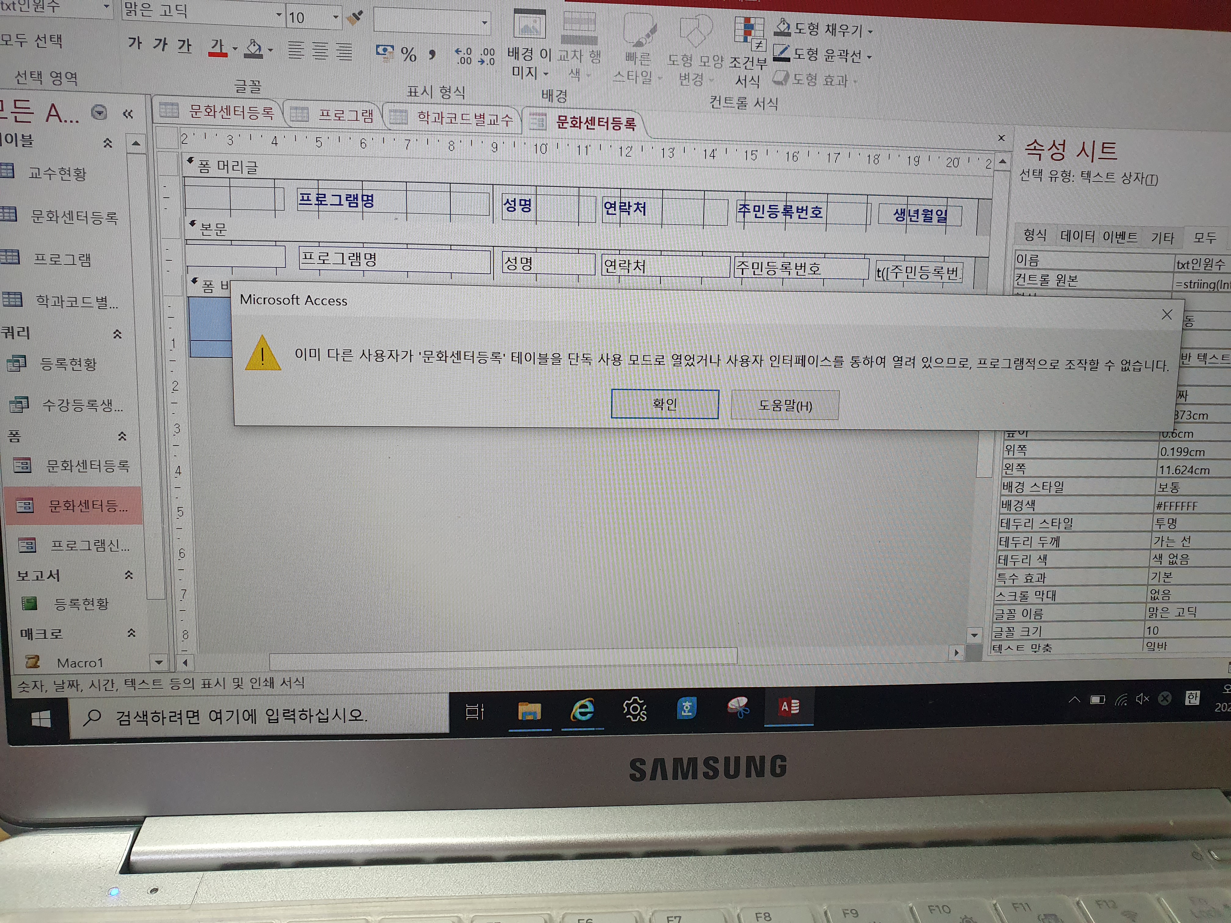 '문화센터등록현황' 폼을 열려고 눌렀는데 이런 메세지가 뜹니다. 그리고 다른 폼도 열리지 않고 보고서도 똑같은 메세지가 뜨면서 열리지 않습니다. 어떻게 해야 하는 건가요?ㅠㅠ 빠른 답변 부탁드리겠습니다ㅠㅠ