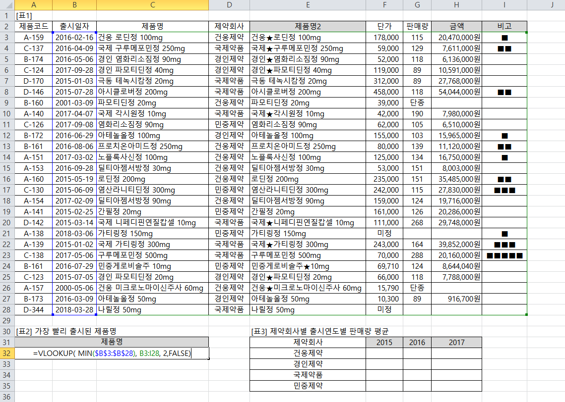 =VLOOKUP( MIN($B$3:$B$28), A3:I28, 3,FALSE)의 의미가 A3~I28까지 범위중에서 3번째 열인 제품명 반환한다는 의미가 아닌가요?