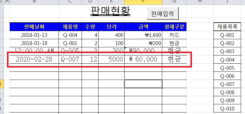 그리고 판매날짜에는 년월일이 아닌 현재시간이 입력됩니다.