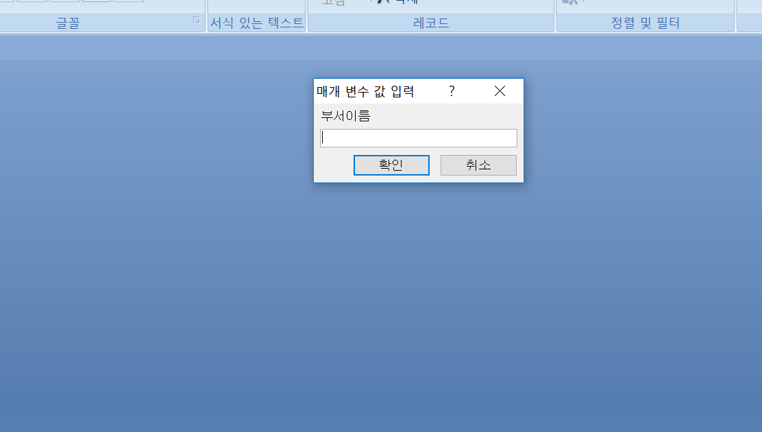 부서이름이라는 필드가 없는 것 같은데요. 아래와 같이 입력하셨는지 확인해보세요. 그래도 안되시면 작성한 액세스 파일 자체를 올려주세요. 파일을 열어봐야 정확한 답변이 가능합니다.