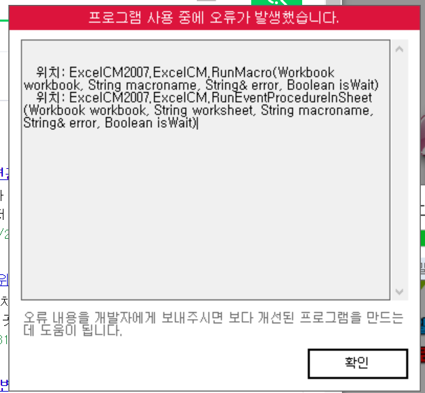 문의하신 오류는 윈도우 환경 문제로 비쥬얼 베이직 쪽에서 오류가 발생한 것으로 보여집니다.