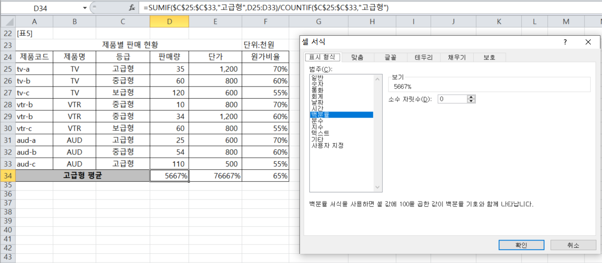 원가비율의 평균만 백분율 스타일을 지정 하세요.