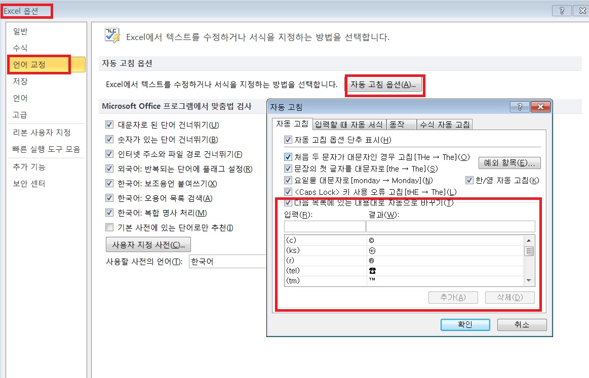 혹시 아래 그림과 같이 엑셀 옵션에 들어가서