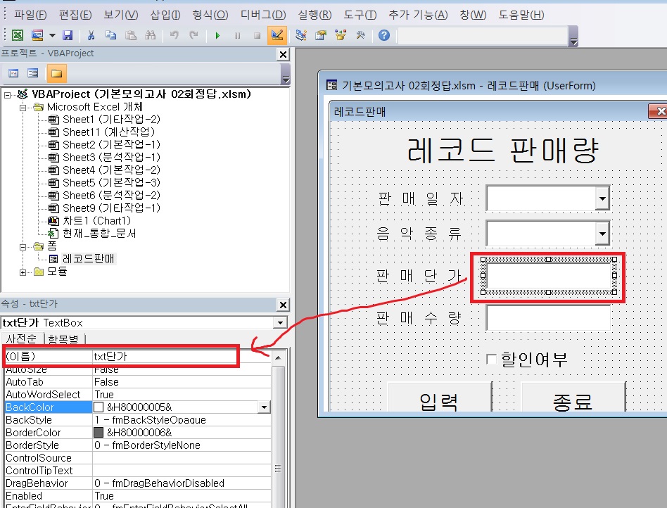 엑셀 기본 모의고사 2회- 문제 4-2-2에서 이벤트 프로시저 작성할 때 궁금한 점이 있습니다.