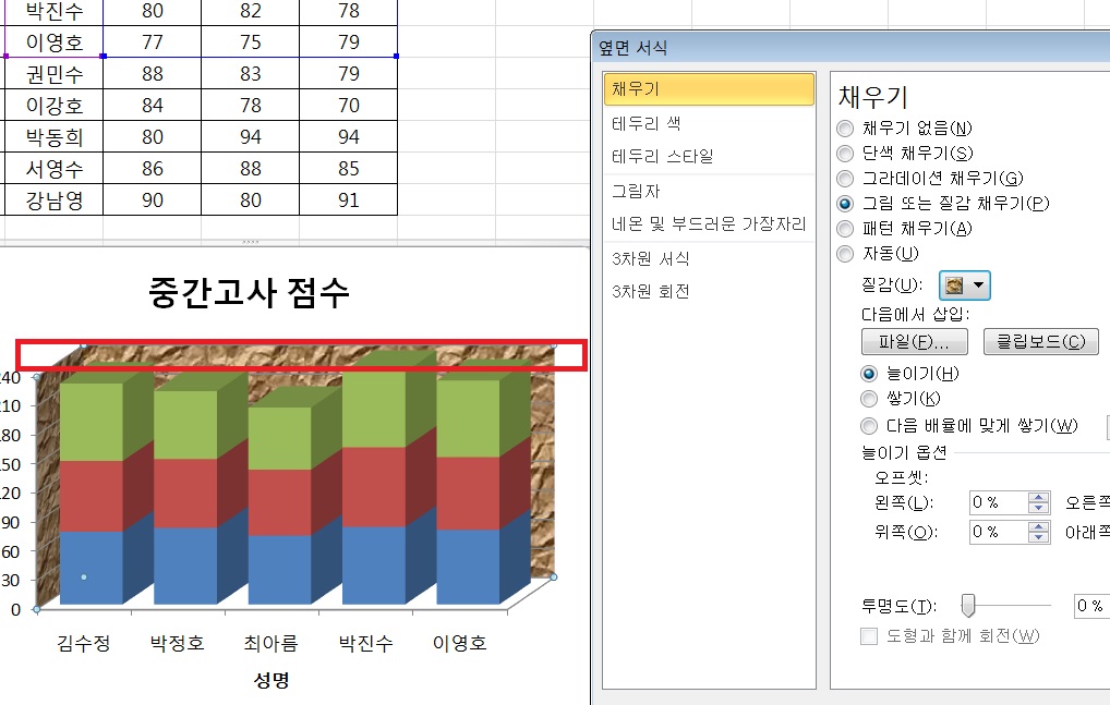 문제 4-5번에 보면 옆면영역에 대해서 언급하고있는데 나와있는 차트 이미지에는 옆면뿐만 아니라 뒷면까지도 종이질감으로 선택되어 있는데