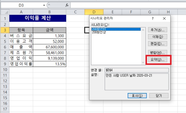 시나리오 두가지 모두 작성한 후에 요약을 눌러 시나리오 요약시트를 만드시면 됩니다.