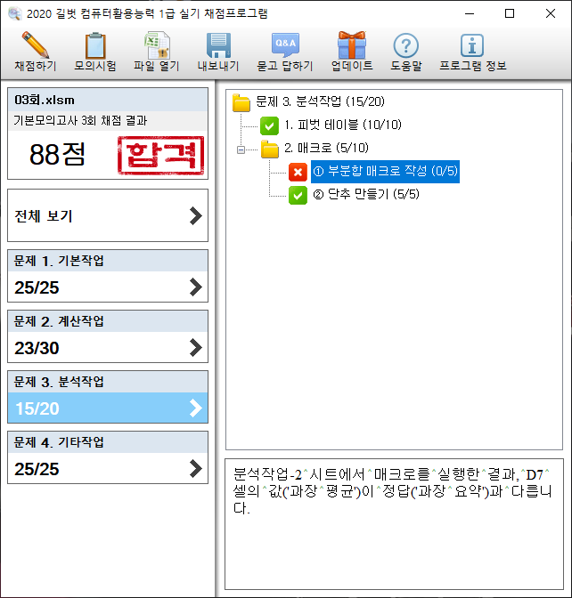 1. 분석작업-2 매크로 실행시, 합계와 평균은 표시되는 순서에 상관없이 처리하라고 되어 있으나 채점프로그램은 하나의 케이스로만 답안판별을 하는 것처럼 보입니다.
