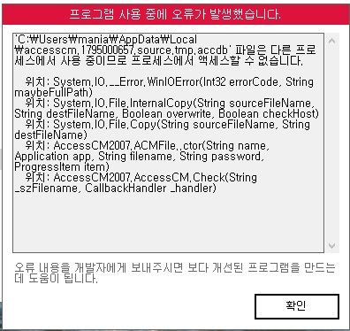 작업관리자에서 엑세스 관련작업 다 종료 후 시도해도 동일합니다.