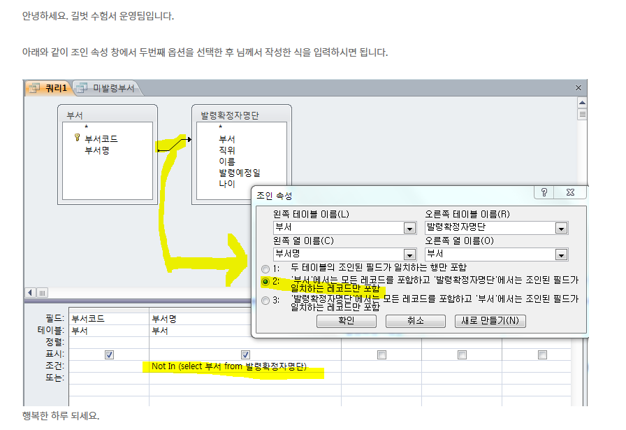 문제에서 not in을 사용하라는 지시가 있을 경우 반드시 이것을 사용해야 합니다. 그렇지 않은 경우에는 마법사를 이용하든 다른 방법을 이용하든 상관없이 문제를 충족시키기만 하면 실제 시험에서는 모두 정다 처리합니다.