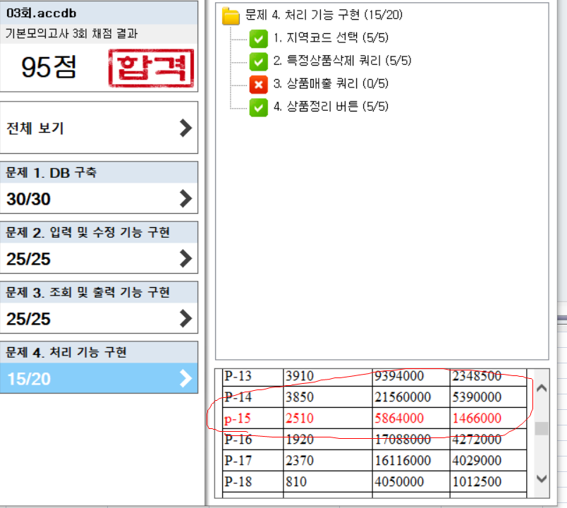 쿼리 문제는 쿼리 내용만 정확하게 하시면 됩니다. 다른 문제들을 풀면서 데이터가 추가되거나 삭제 및 수정되는 상황이 발생해서 결과가 다를 수 있습니다. 실제 시험에서도 쿼리만 가져다가 새로운 데이터에 적용해봅니다. 이점 감안하여 채점 결과를 적용시켜 주세요.