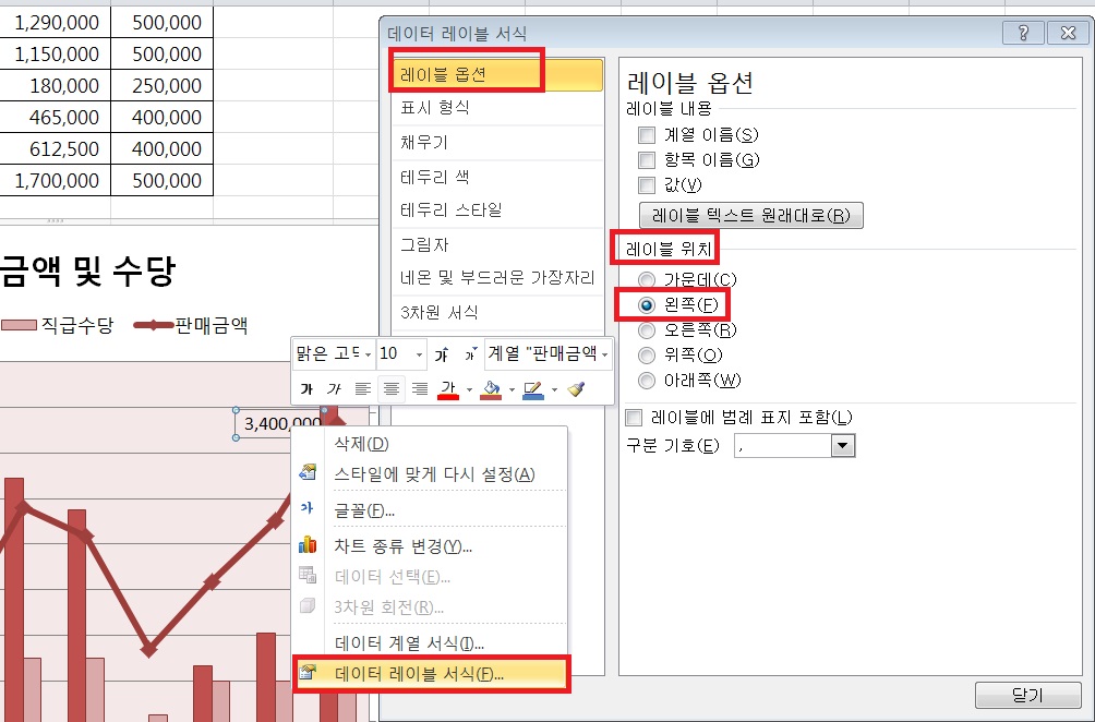 여기서 데이터 계열이 화면상 왼쪽에 설정하라고 했는데