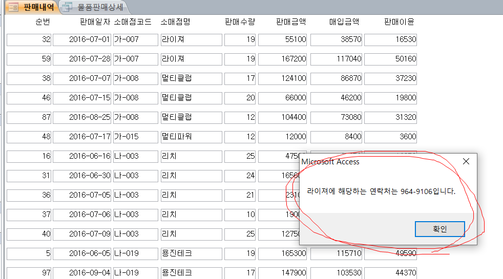 MsgBox txt소매점명 & "에 해당하는 연락처는 " & DLookup("전화번호", "물품판매상세", "txt소매점명=소매점명") & "입니다."