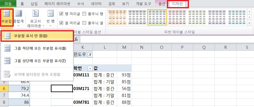 피벗테이블 -> 디자인-> 부분합 -> 부분합 표시 안함