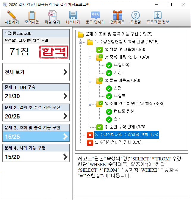 3. 조회 기능 구현 채점이 거의 항상 저렇게 나오면서 오답 처리가 됩니다. 인쇄도 마찬가지로 뜨고요.. 제 컴퓨터 환경이 이상한 건지 한번 채점을 부탁드립니다.