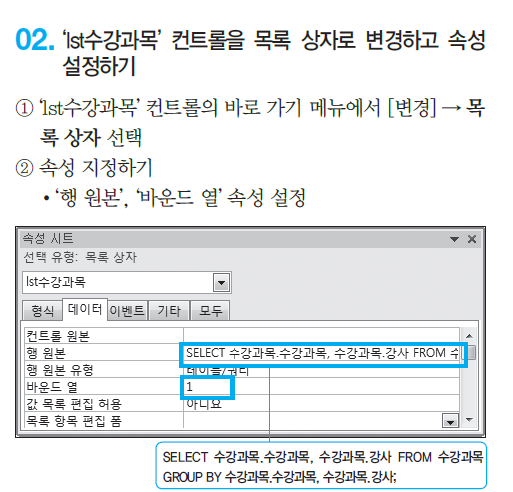 1번 문의는 문제2-2번 lst수강과목 컨트롤을 목록 상자로 변경하고 속성 설정하기 내용에 대한 문의입니다. 풀이에서는 group by를 지정해 주었는데