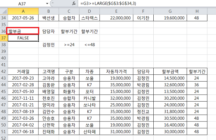 고급필터에서 정답에 나온대로 입력했는데 담당자가 김정민인 데이터들만 출력이 돼서 틀리다고 하네요 왜 그런가요?