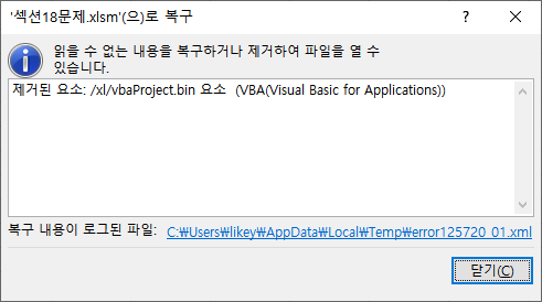VBA 파일 실행 오류와 관련하여 특정 업데이트를 제거하면 해결되는 것을 확인하였습니다.