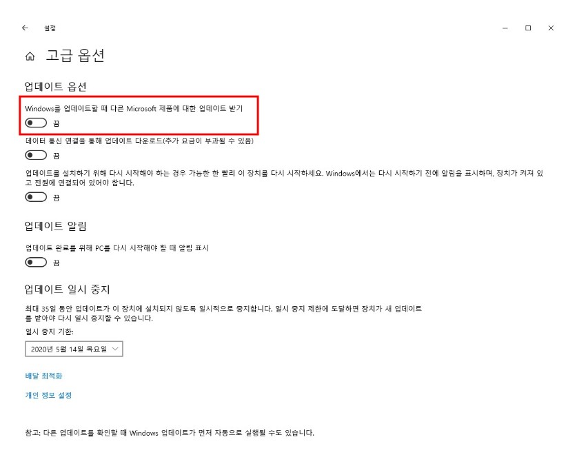 2. 이후 재 업데이트 방지를 위해 [제어판] - [Windows 업데이트] - [고급 옵션] - 'Windows를 업데이트할 때 다른 Microsoft 제품에 대한 업데이트 받기' 옵션 끄기를 수행해주세요.